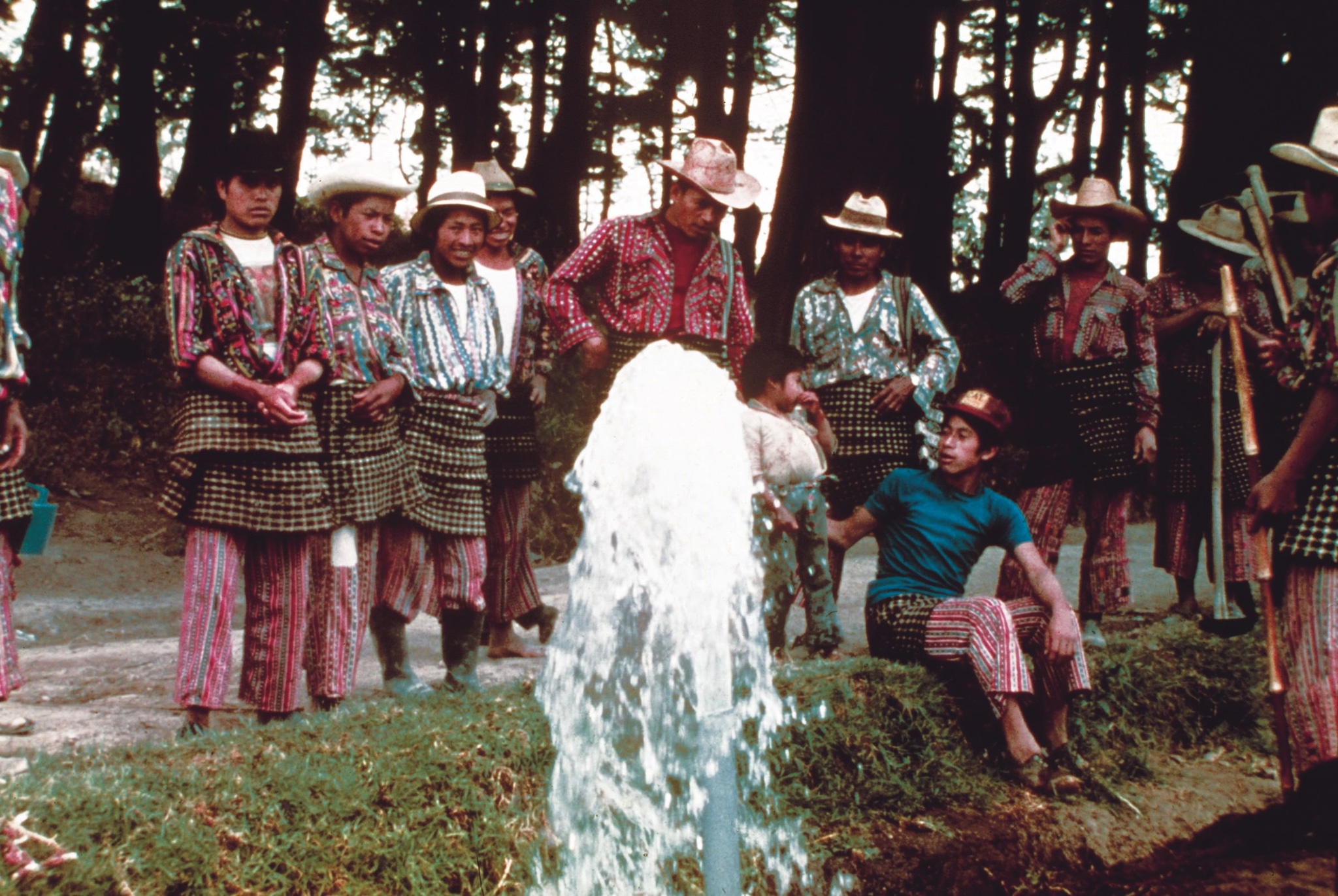 San Bartolo gets water. Agustín Xoquic directly behind spout, his son Fausto sits on the right.