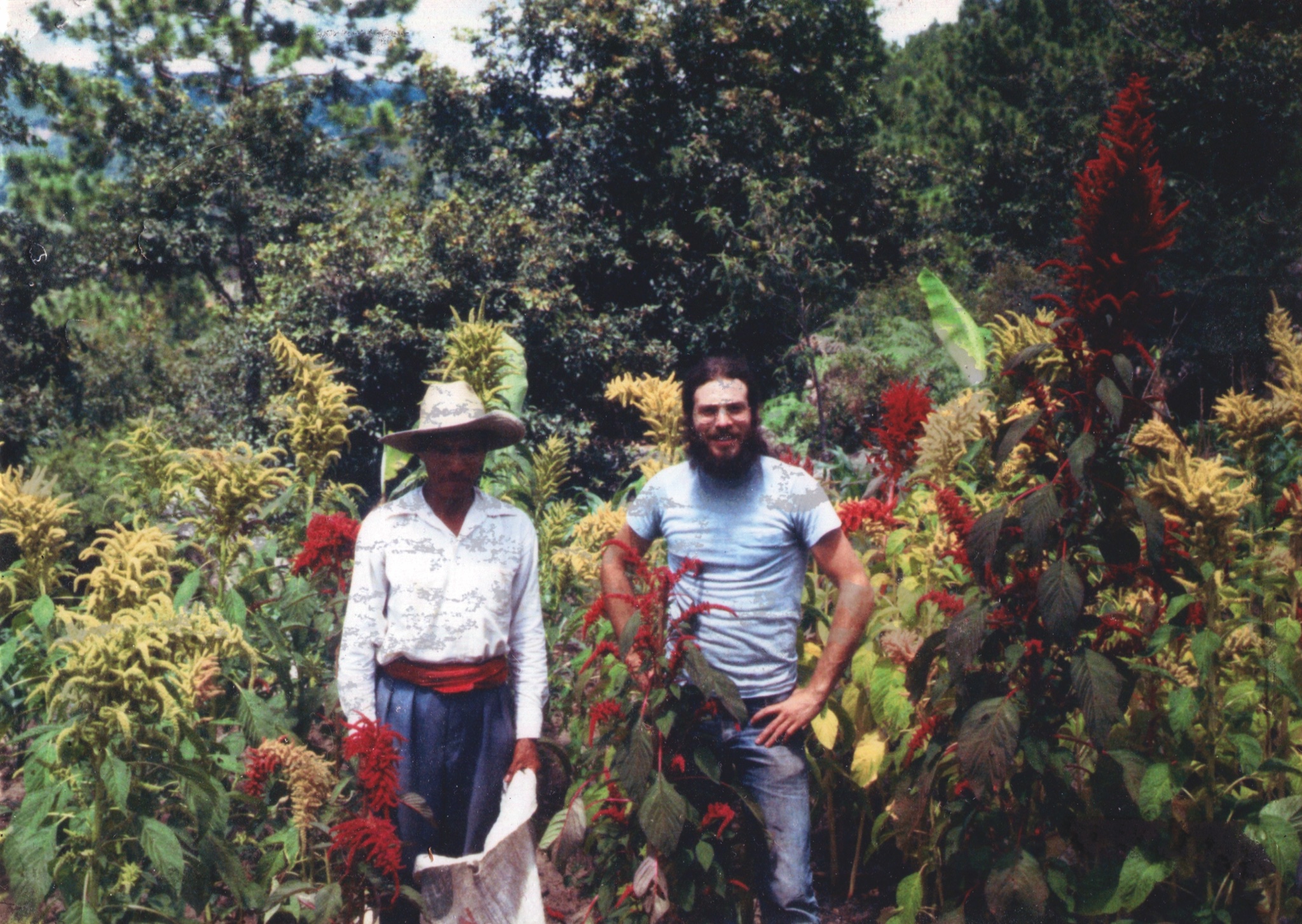 Claro and Alan Praskin in a beautiful stand of amaranth in the highlands of Guatemala.